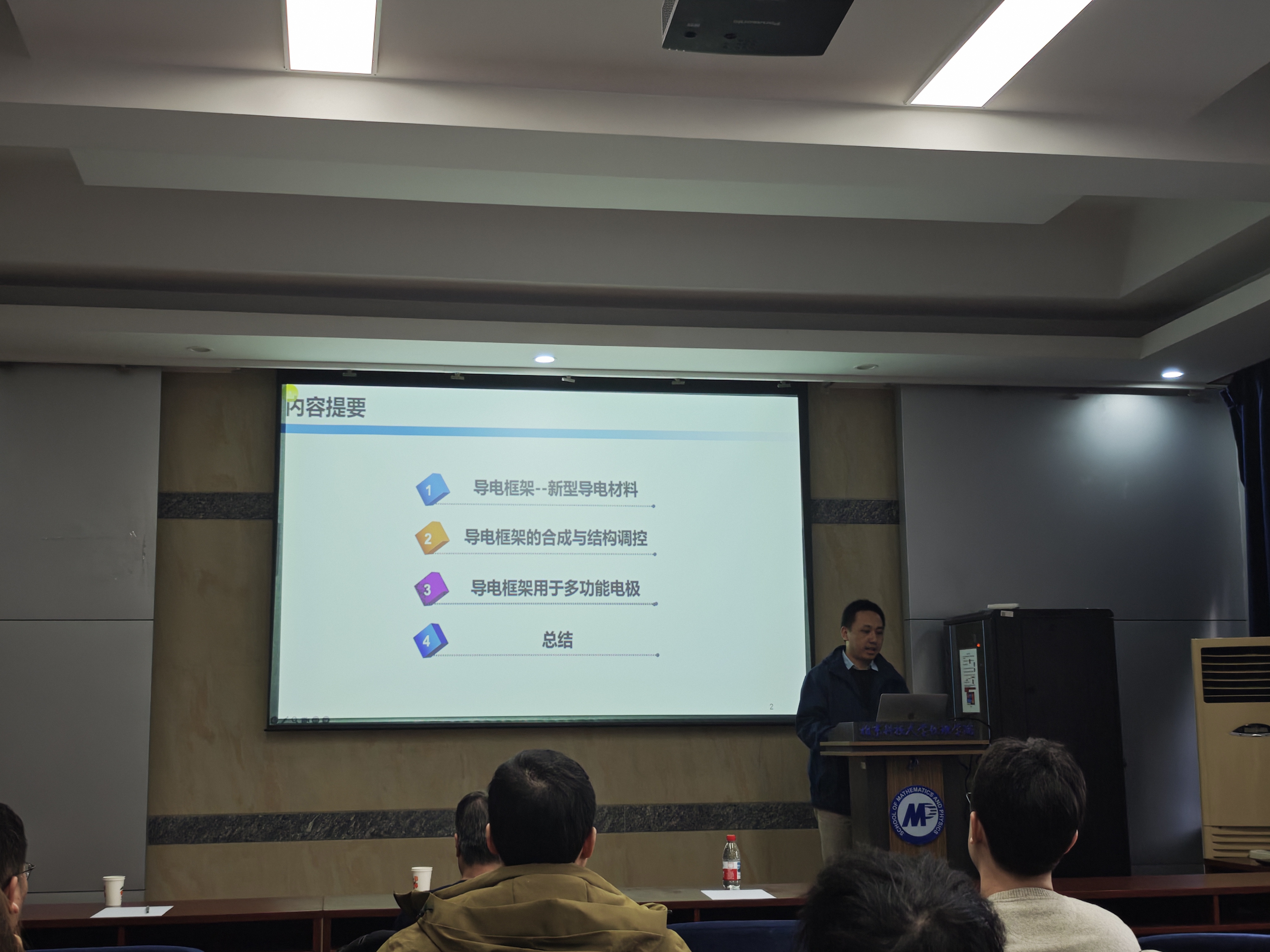 讲座期间,孟征教授在理化楼402室为与会师生做了题为“导电金属有机框架的物性调控与电化学应用”的学术报告。报告中,孟征教授重点讨论了与二维导电金属有机框架的结构、性能和应用相关的基本科学问题与挑战。报告围绕导电框架中的基本结构-性质关系,深入讨论了配体的共轭结构、拓扑、重原子引入以及取代基等对材料电性质的影响。孟征教授还展示了导电金属有机框架在功能电极方面的应用,探索了导电材料在电化学二氧化碳吸附、有机转化的可行性。