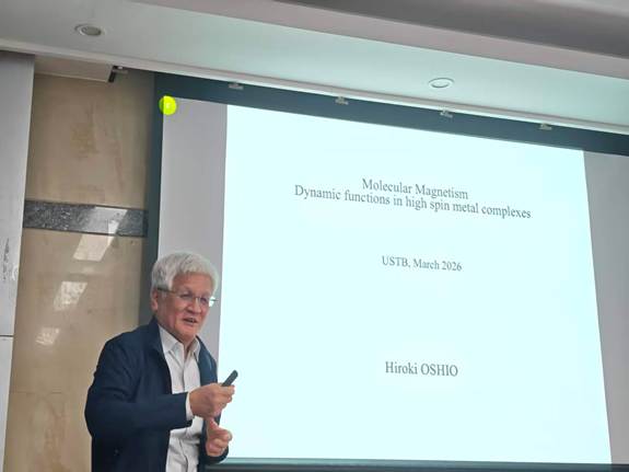 Hiroki Oshio 教授做了题为“Molecular Magnetism: Dynamic functions in high spin metal complexes”的学术报告。在报告中,他介绍了分子磁体的发展历程,阐述了自旋化学、磁相互作用的调控,以及SMM、SCO和MV配合物的动态行为,使在场师生对金属配合物的分子磁性有了深入的了解。
